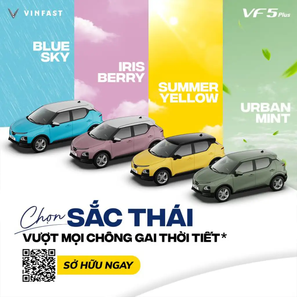 VinFast VF5 Plus mang đến dải màu sắc phong phú, gồm 4 màu cơ bản (Xám, Đỏ, Xanh dương, Trắng) và 4 màu nâng cao mới (Vàng, Hồng tím, Xanh dương nhạt, Xanh lá nhạt), giúp thể hiện phong cách cá nhân của chủ sở hữu. Tùy chọn màu sắc nội thất đồng điệu với thiết kế ngoại thất tạo điểm nhấn nổi bật, nâng tầm vẻ đẹp cho mẫu xe điện VF5 Plus.