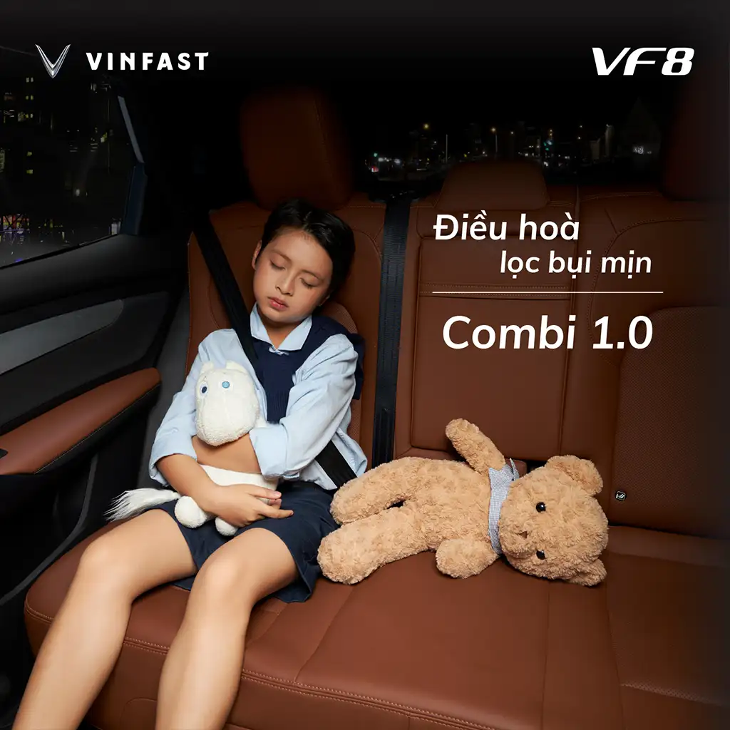 Nội thất VF 8 tinh giản, 5 chỗ ngồi, 2 hàng ghế thoải mái. Cụm đồng hồ thay bằng màn hình HUD hiển thị tốc độ, dung lượng pin. Màn hình giải trí 15,6 inch, kết nối điện thoại, USB loại C. Ghế sưởi (Eco) và sưởi – thông gió (Plus). Xe có chế độ lọc không khí Combi 1.0. Hệ thống âm thanh 8–10 loa mang lại trải nghiệm sống động.