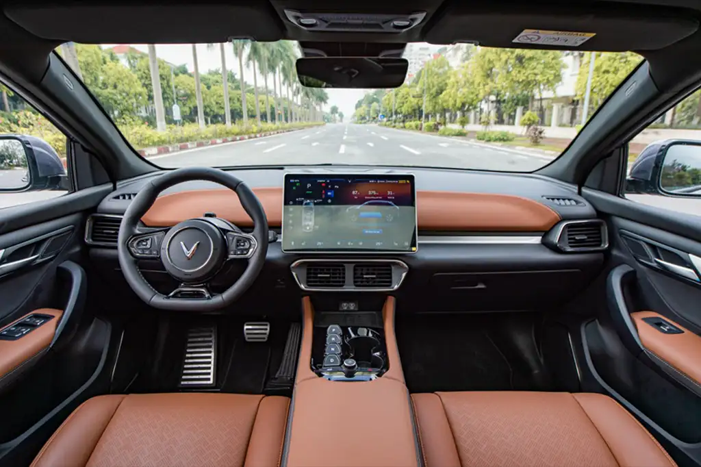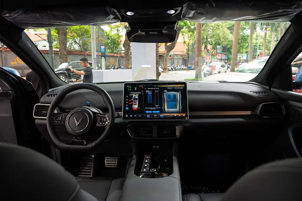 Nội thất VF 8 tinh giản, cụm đồng hồ thay bằng màn hình HUD hiển thị tốc độ và dung lượng pin. Xe có 5 chỗ ngồi, 2 hàng ghế thoải mái, không gian rộng rãi, vô lăng tích hợp nhiều chức năng tiện nghi.