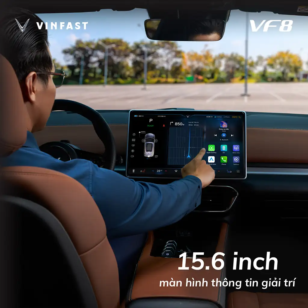 Khoang lái VF 8 có vô lăng và bảng taplo hiện đại, cụm đồng hồ thông tin thay bằng màn hình HUD, tích hợp màn hình giải trí 15,6 inch, tối giản nút bấm vật lý để dễ dàng theo dõi và điều chỉnh thông tin hành trình.